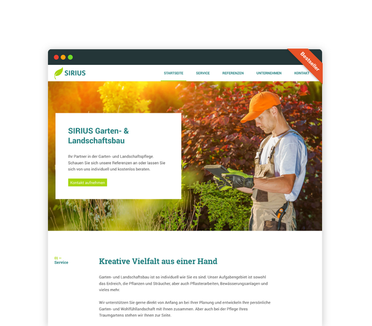Das Onepager Theme für maximale Effizienz. SIRIUS ist ideal, wenn du dein Unternehmen kurz, knackig und mit direktem Kontakt präsentieren willst. Perfekt für den schnellen Start, wenn es auf das Wesentliche ankommt.