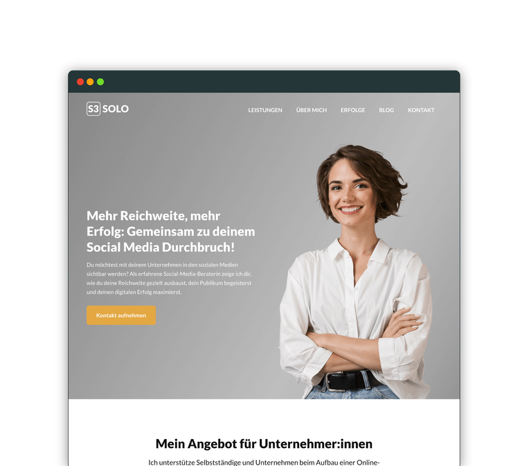 Das Theme speziell für die One-Person-Show: Solo-Selbstständige, Freelancer oder Künstlerinnen und Künstler. Wenn du deine persönliche Marke in den Mittelpunkt stellen willst, bietet SOLO die perfekte Bühne für deinen Auftritt.